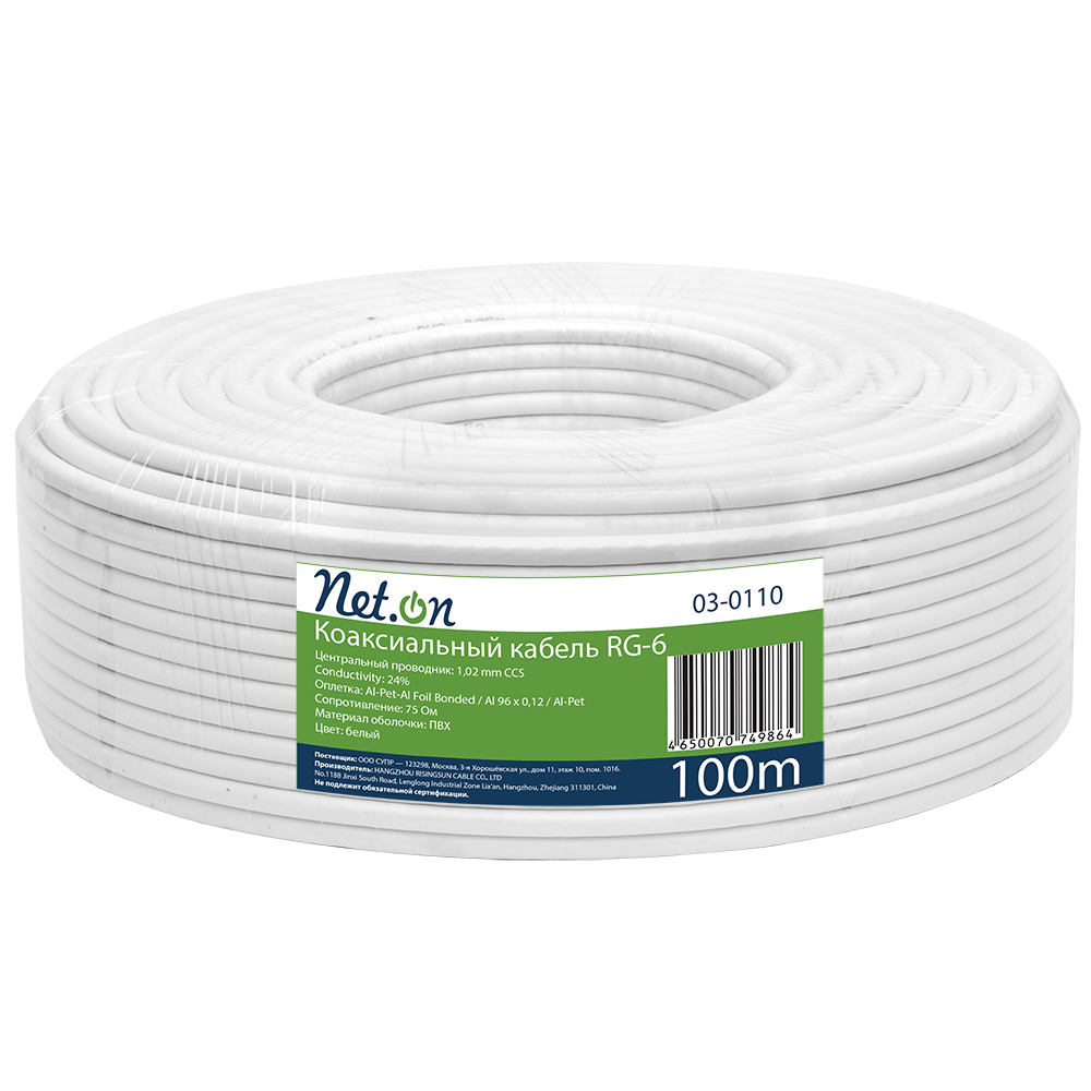 Центральная жила кабеля RG-6 покрыта диэлектриком из вспененного полиэтилена (специальный изолирующий материал). Поверх расположены 3 экрана – фольга из алюминия (накладывается на сердечник) и оплетка из алюминиевых проволок. Внешняя оболочка кабеля RG-6 выполнена из ПВХ. Кабели в оболочке из ПВХ, как правило, применяются для прокладки внутри помещений.