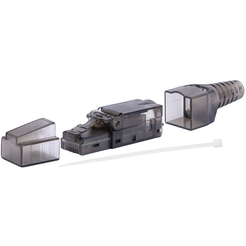 Коннектор RJ-45 с фиксатором кабеля используется для оконцевания кабеля витая пара в полевых условиях. Основными преимуществами такого коннектора является возможность использования его на кабелях большого диаметра (до 9 мм), надежная фиксация коннектора к кабелю.