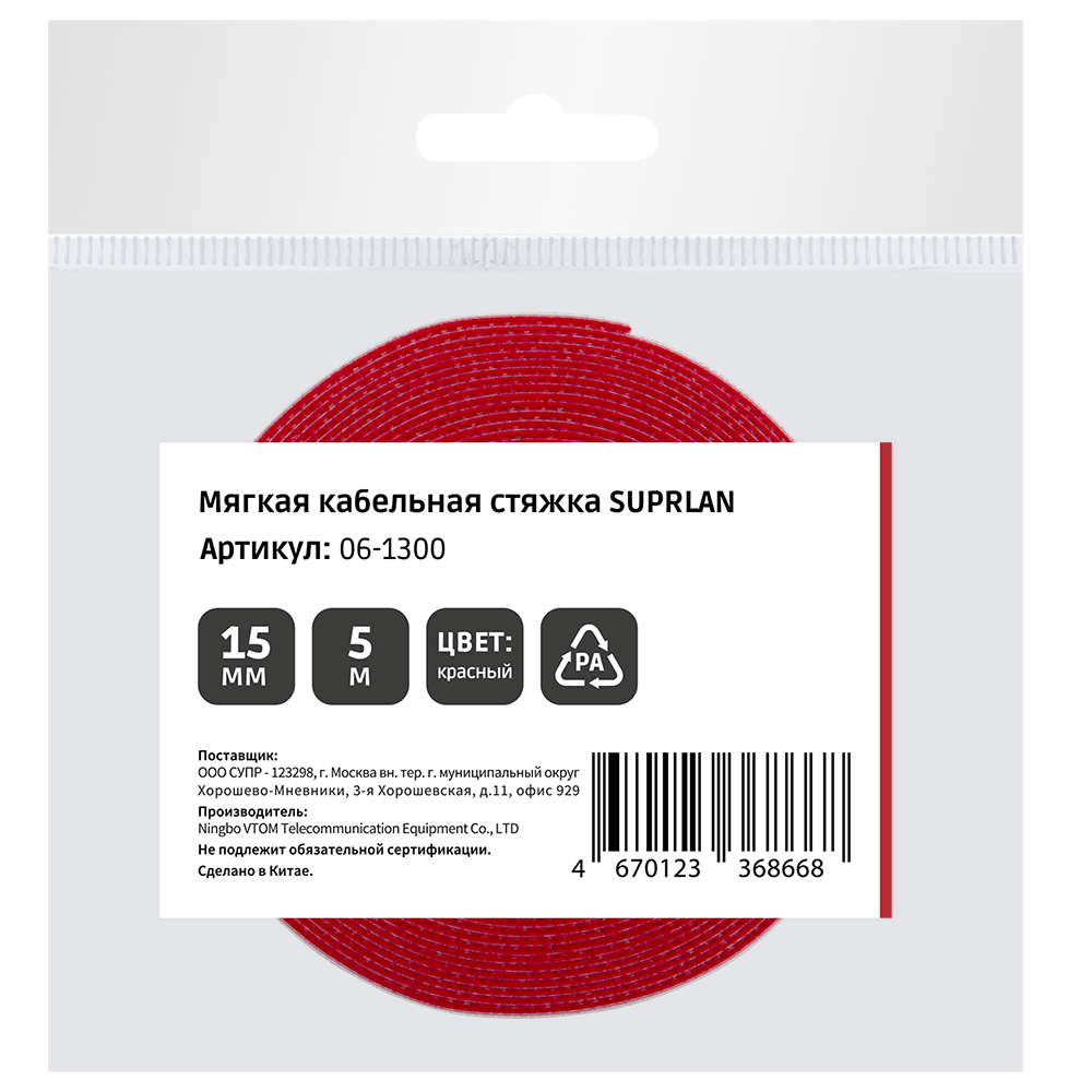 Мягкая кабельная стяжка SUPRLAN 15мм, красный 5м