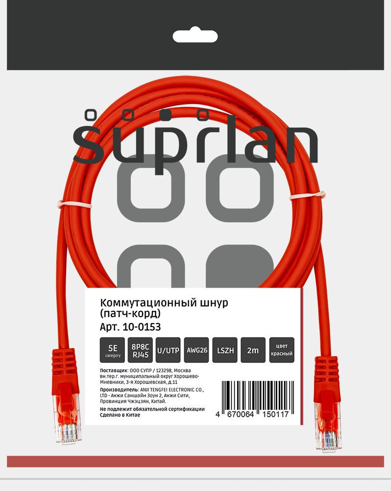 Патч-корд SUPRLAN UTP 5e 4x2 26AWG (7x0.16mm) Cu LSZH красный 2м