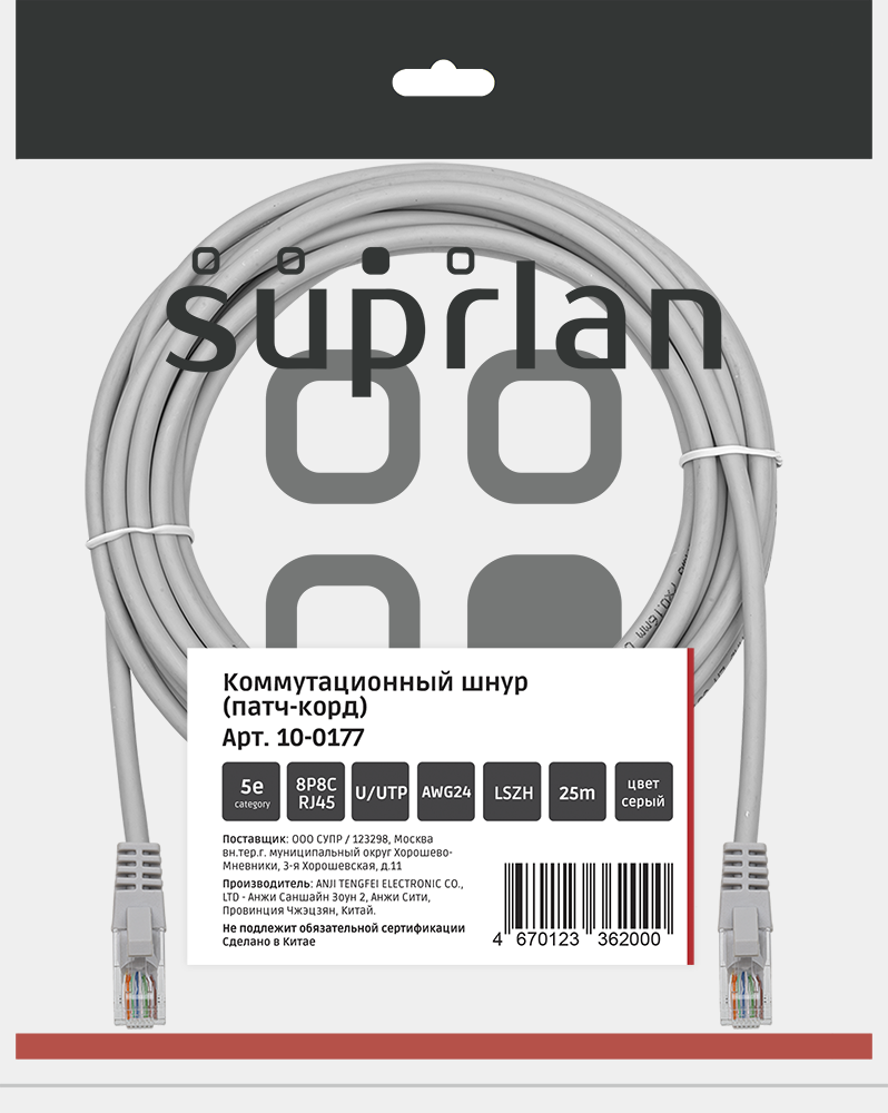 Патч-корд SUPRLAN UTP 5e 4x2 24AWG (7x0.2mm) Cu LSZH серый 25м