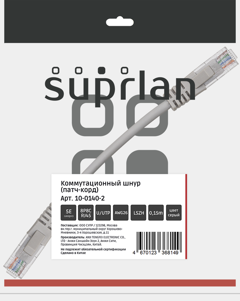 Патч-корд SUPRLAN UTP 5e 4x2 26AWG (7x0.16mm) Cu LSZH серый 0,15м