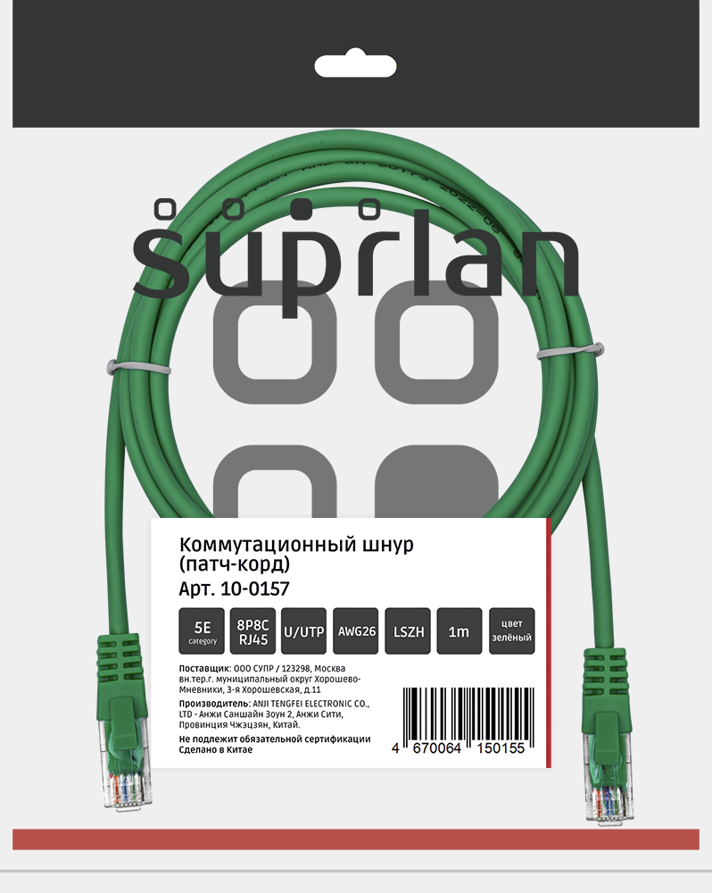 Патч-корд SUPRLAN UTP 5e 4x2 26AWG (7x0.16mm) Cu LSZH зеленый 1м