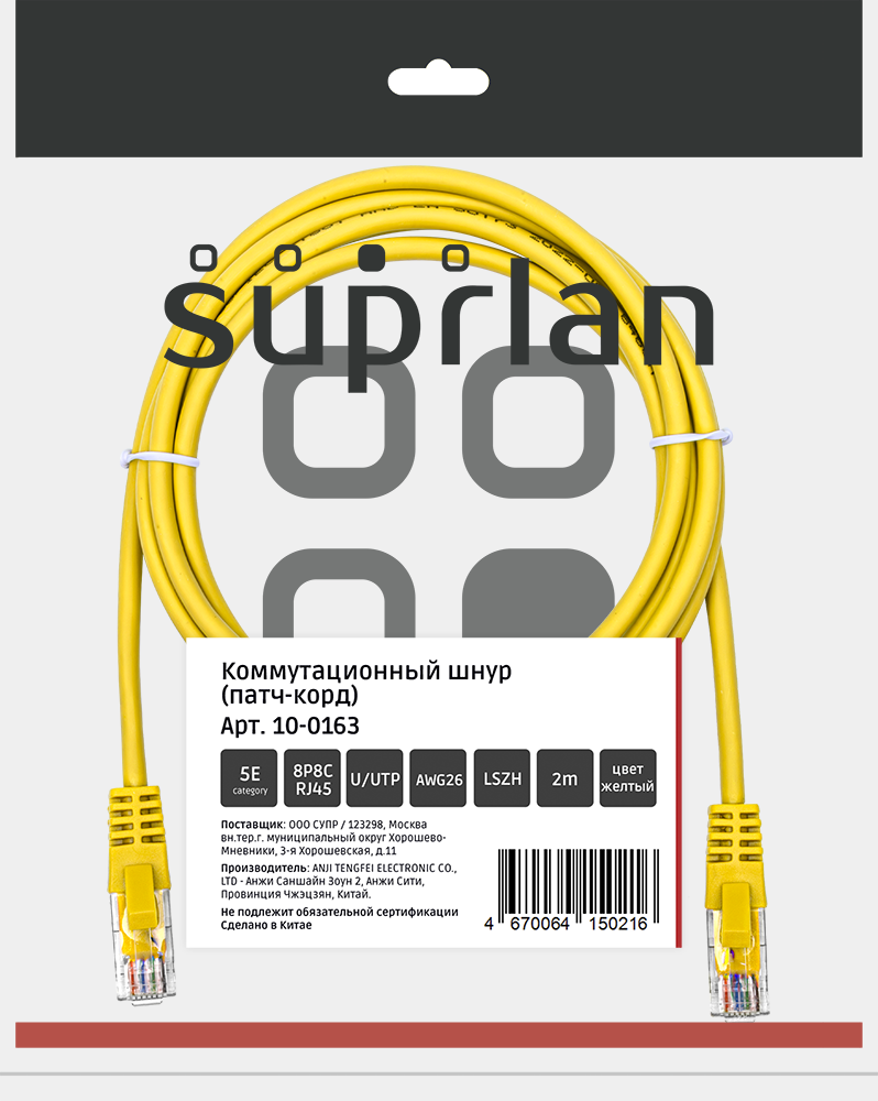Патч-корд SUPRLAN UTP 5e 4x2 26AWG (7x0.16mm) Cu LSZH желтый 2м