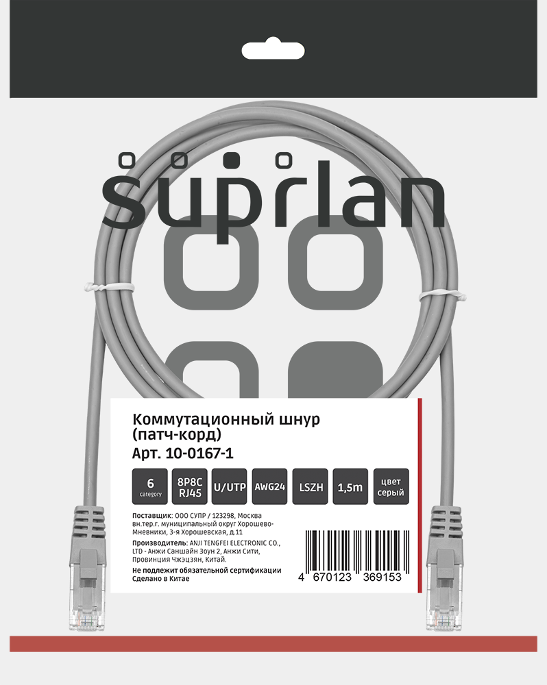 Патч-корд SUPRLAN UTP 6 4x2 24AWG (7x0.2mm) Cu LSZH серый 1,5м