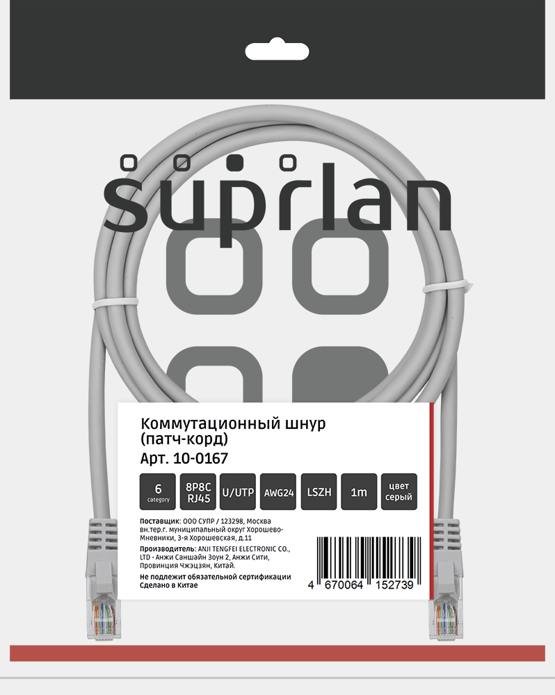 Патч-корд SUPRLAN UTP 6 4x2 24AWG (7x0.2mm) Cu LSZH серый 1м