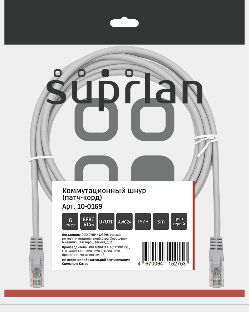 Патч-корд SUPRLAN UTP 6 4x2 24AWG (7x0.2mm) Cu LSZH серый 3м