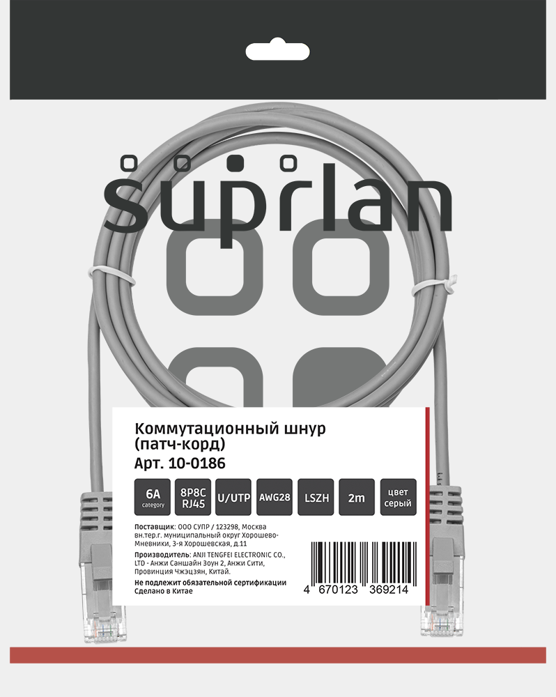 Патч-корд SUPRLAN UTP 6a 4x2 28AWG Cu LSZH серый 2м