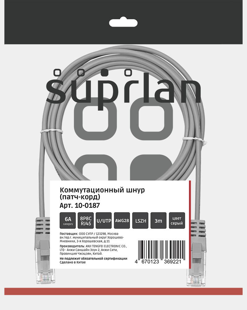Патч-корд SUPRLAN UTP 6a 4x2 28AWG Cu LSZH серый 3м