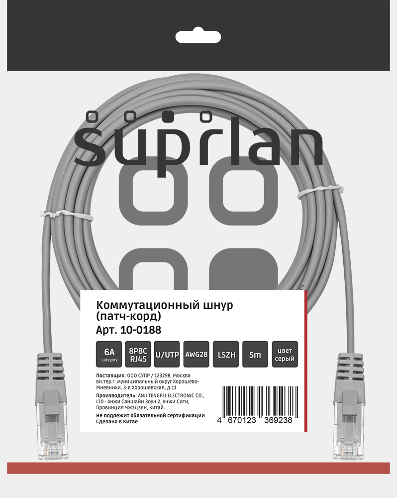 Патч-корд SUPRLAN UTP 6a 4x2 28AWG Cu LSZH серый 5м