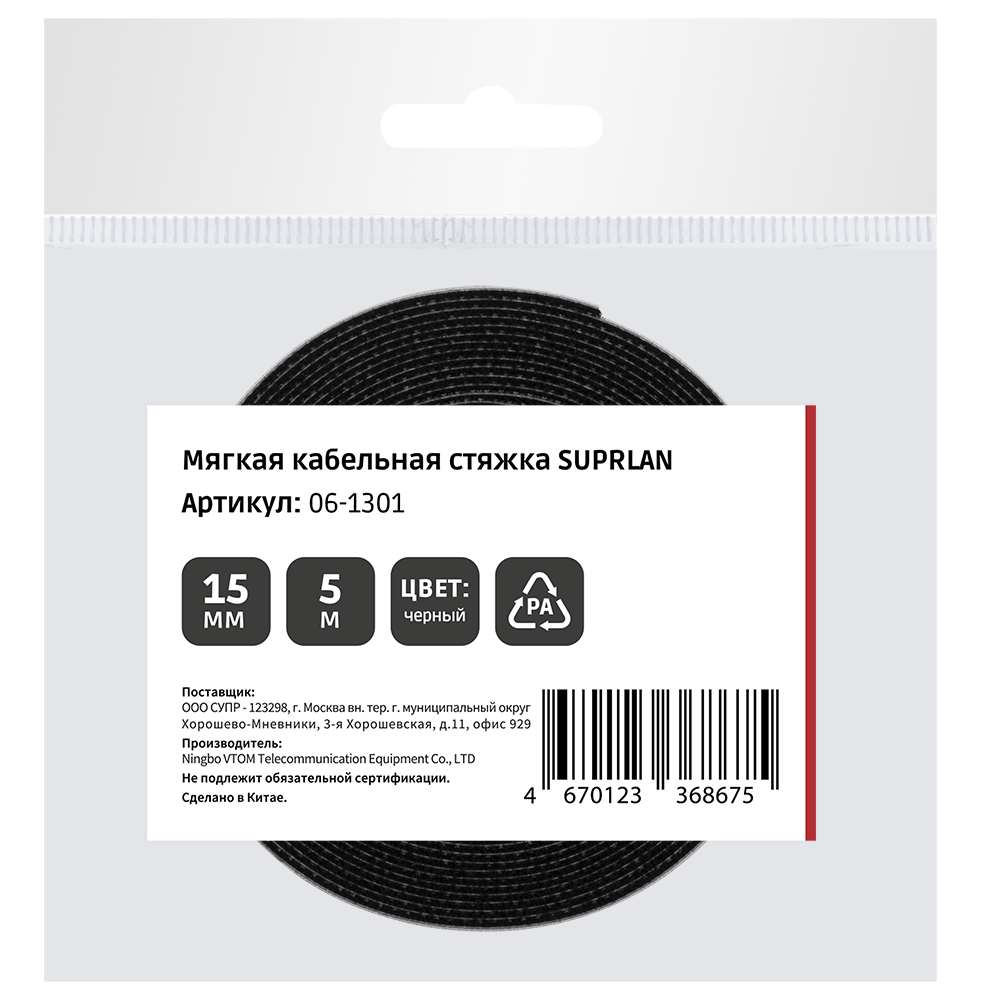 Мягкая кабельная стяжка SUPRLAN 15мм, чёрный 5м