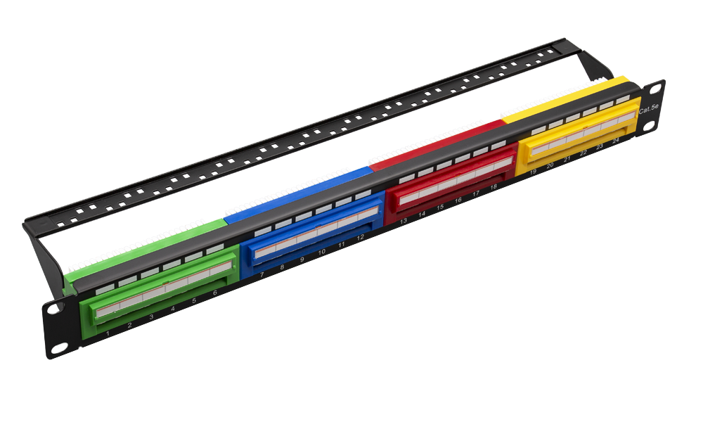 Патч-панель 19", 24хRJ-45, UTP, 5e, 1U, угол портов 45 градусов, цветные блоки