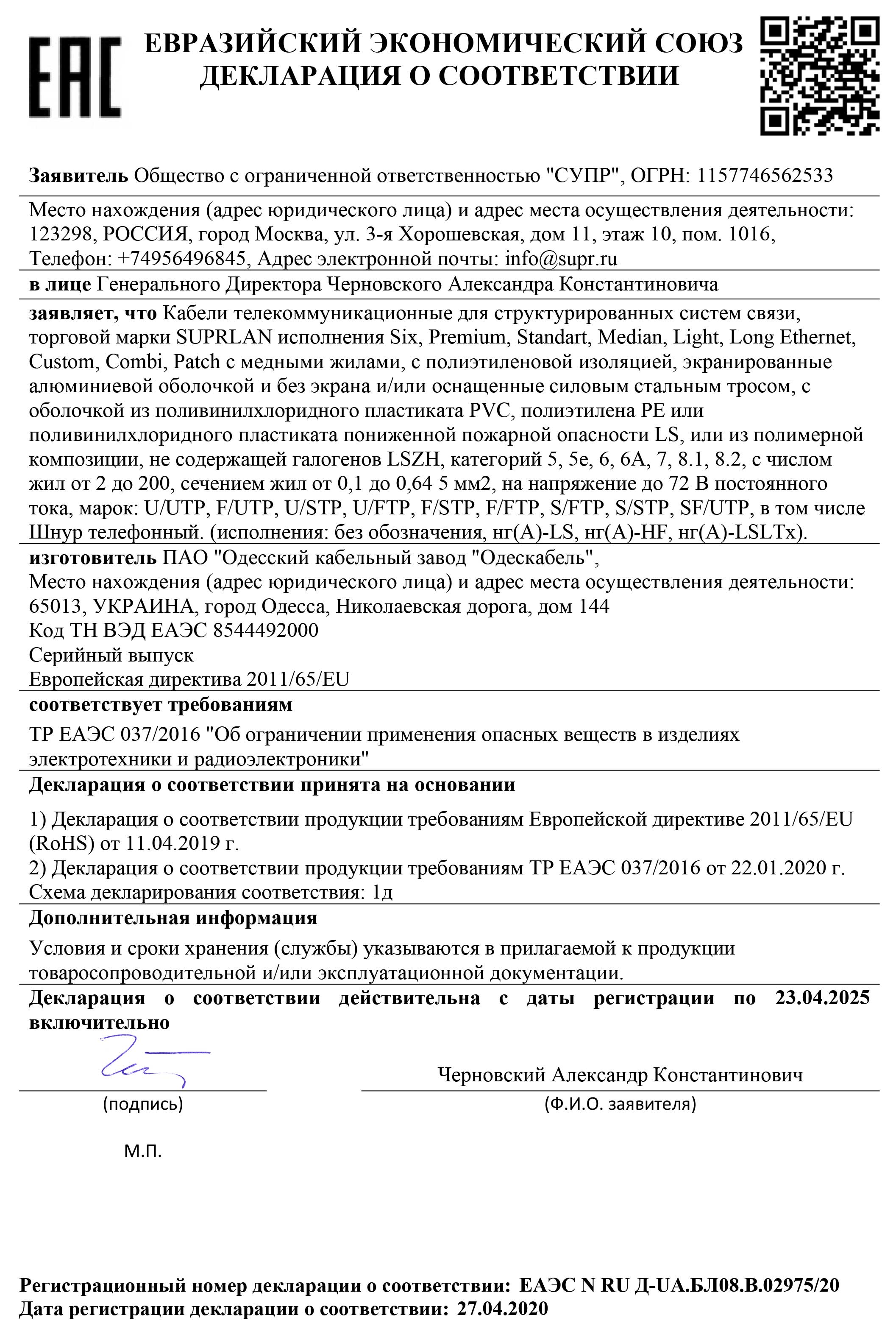 Мы напоминаем, что наша продукция всегда соответствовала и соответствует требованиям RoHS. Это значит, что для производства кабелей под торговой маркой Suprlan применяются только первичные материалы аккредитованных поставщиков.