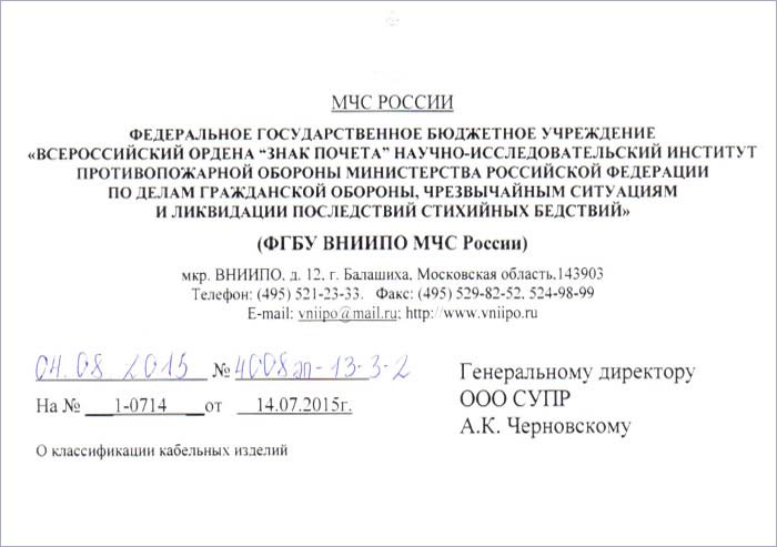 В продолжении темы пожарной безопасности при использовании кабеля UTP/FTP в жилых зданиях публикуем ответ на наш запрос ФГБУ ВНИИПО МЧС России (ведущего НИИ пожарной безопасности, издателя нормативных документов по этой теме). Из данного письма однозначно следует, что при применении кабеля в жилых зданиях необходимо использовать тип кабеля по классу пожарной опасности не ниже нг(…)-LS